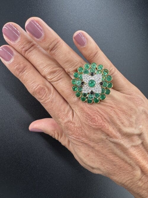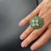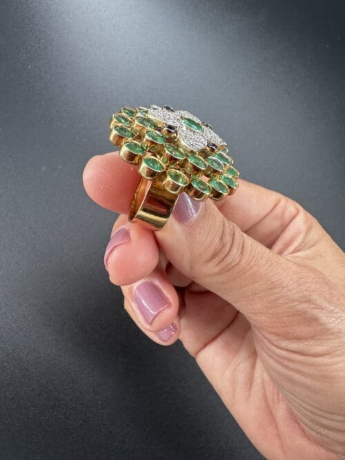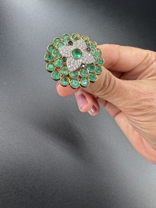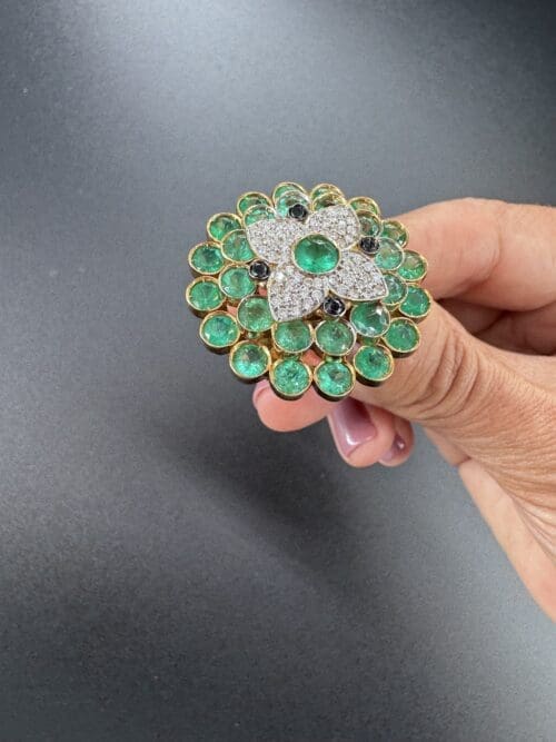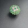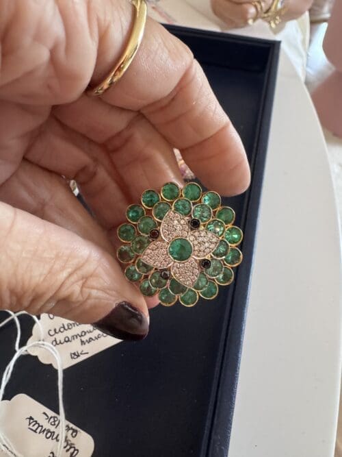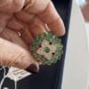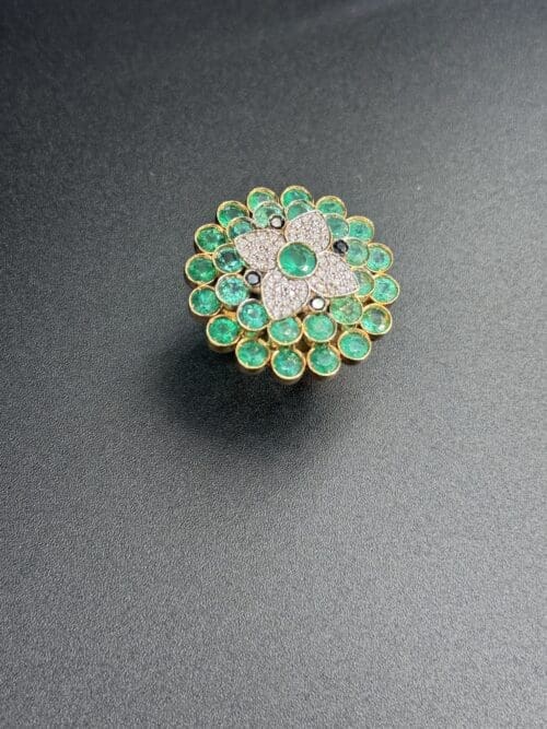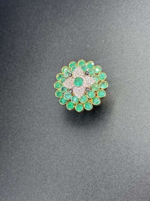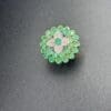 At the center, a luminous composition of diamonds enhances the brilliance of a vivid green gemstone, while a surrounding halo of green stones adds depth, freshness, and movement to the piece.