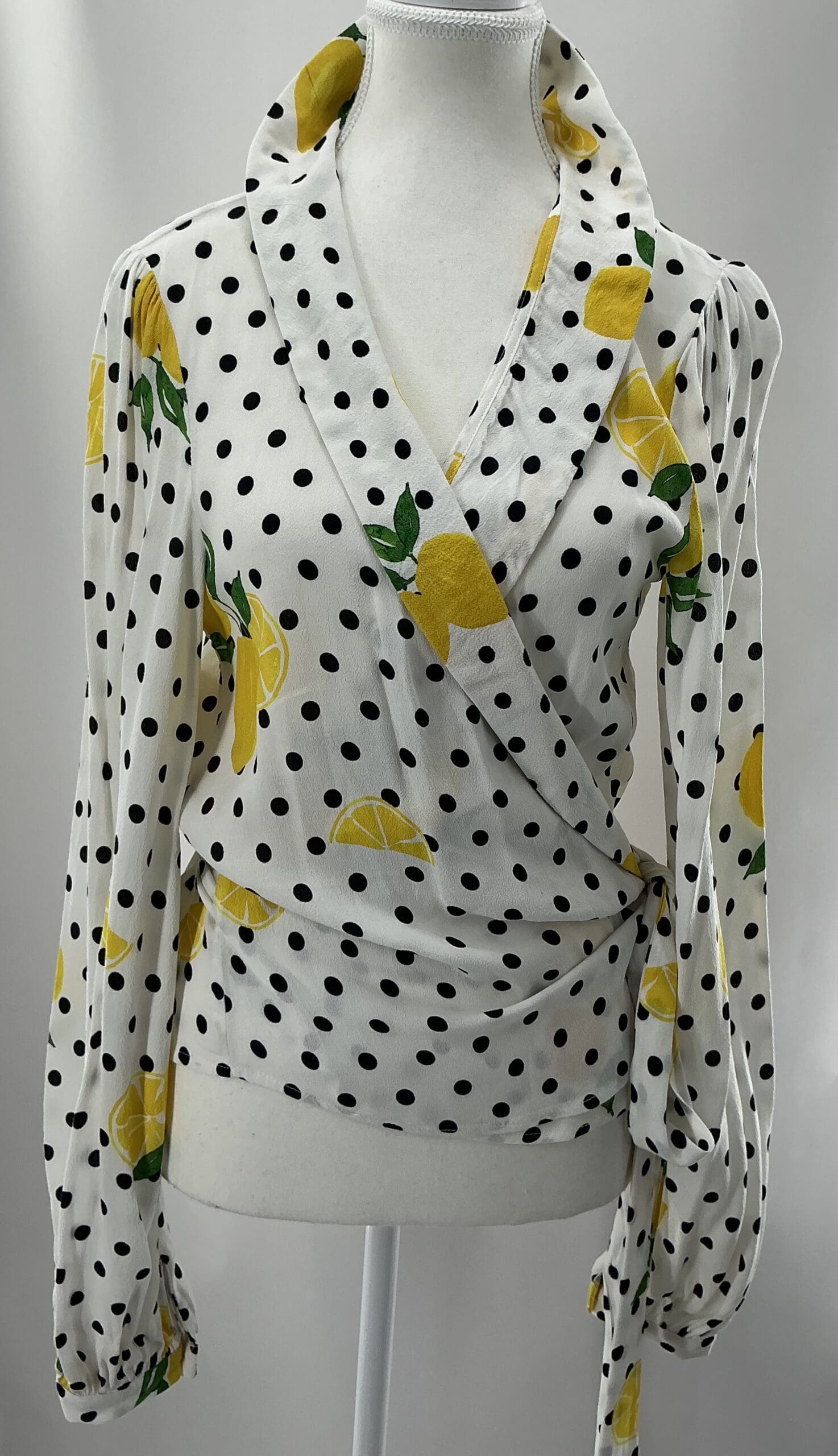 Wrap Polka Dots Blouse,Black and White, Sicilian Lemons Printed,Crepe. Size: S/M