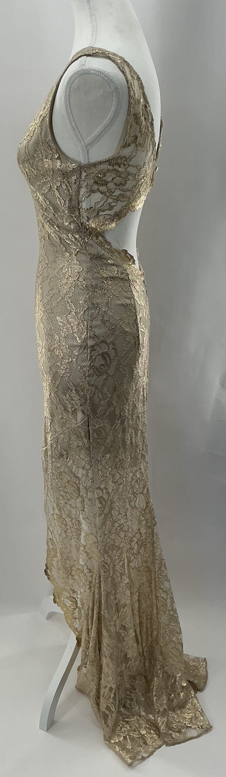 Long Gold Lace Dress, V Neck, Front Slit, Back Neckline.